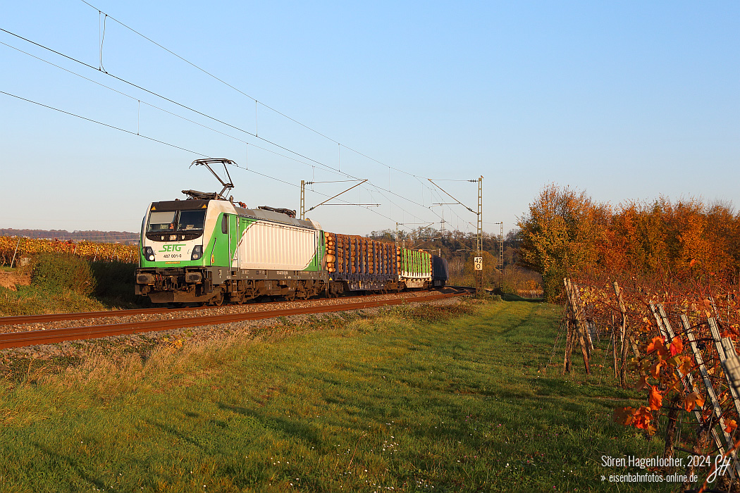 20Holz im herbstlichen Abendlicht Am Nachmittag des 9. November 2024 stand ursprünglich der ICE 118 auf der Liste. Da der Zug jedoch nur zur Hälfte gereinigt war, eine Motividee nicht wirklich vorhanden war und sich ein schöner Holzzug ankündigte, wurde der Plan spontan geändert. In der tiefstehenden Sonne des 9. November 2024 wurde 487 001 mit DGS 95225 Neckarelz - Augsburg Rbf (Sdl., Holz) bei Lauffen sehnlichst erwartet, bevor kurz darauf Wolken reinziehen sollten. Im Nachhinein auf jeden Fall die besser Wahl, denn ICE-Fotos sind zur Genüge vorhanden.