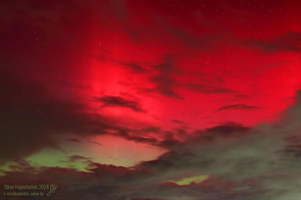 17Polarlichter im Süden (II) Am späten Abend des 10. Oktober 2024 waren wieder Polarlichter im Südwesten zu sehen, wie hier in Cleebronn vom Michaelsberg aus. Anders als im Frühjahr 2024, waren nun auch die Farben rot und grün zu erkennen. Den rot leuchtenden Himmel konnte man auch mit dem bloßen Auge zeitweise deutlich wahrnehmen. Ein wahnsinnig schönes Spektakel!