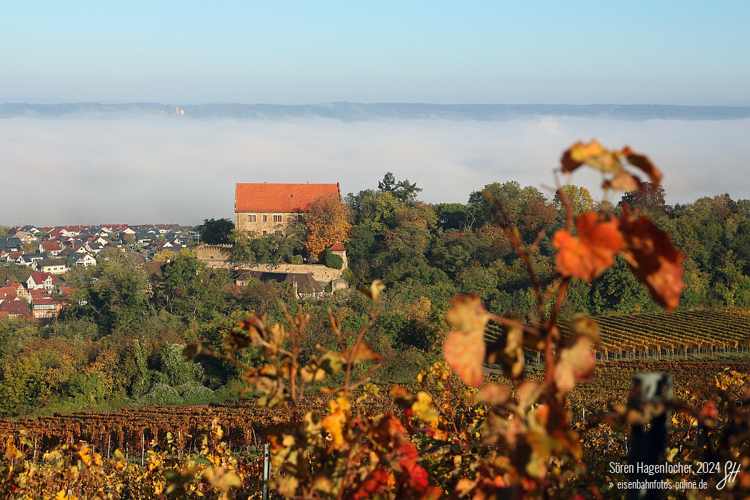 18Schloss Magenheim im Herbst Im Oktober 2024 gab es einzelne, richtig schöne Tage. Eines meiner Lieblingsfotos entstand am Michaelsberg, wo man zum einen die herbstlich gefärbten Reben bewundern konnte, zum anderen den Nebel im Tal, der zwischen dem Schloss Magenheim und dem Schloss Stocksberg vorhanden war. Das darunter gelegene Zabergäu war an jenem Morgen noch unter dem Nebel verborgen.