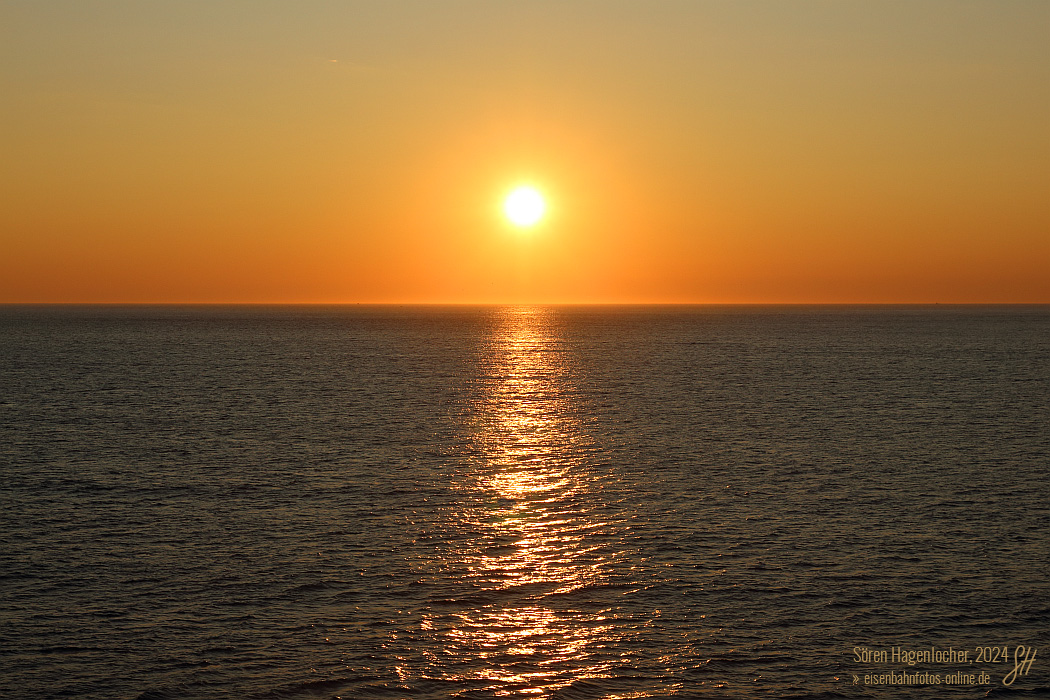 15Sonnenaufgang auf der Barentsee Je weiter die Reise nordgehend verlief, desto reizvoller wurde es, mal nachts die langen Tage zu bewundern. Der frühe 10. August 2024 schien mir hierzu ideal zu sein, sowohl vom Wetter her als auch vom zu erwartenden Sonnenaufgang über der Barentsee. Letzten Endes wachte ich fast eine Stunde später auf als geplant (glücklicherweise bin ich kein Bäcker). Dieser spätere Zeitpunkt sollte sich jedoch als ideal erweisen. Einige schöne Impressionen waren drin, da die Sonne mit etwa 2,5 Grad Höhe um 3:16 Uhr schön über dem Horizont stand - und wir kurz darauf in Vardø anlegten, wo erste Sonnenstrahlen ein echtes Erlebnis waren.