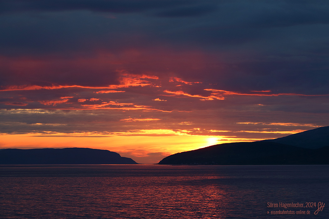 16Sonnenuntergang bei Arnøya Am 11. August 2024 stand die Stadt Hammerfest nördlich des Polarkreises auf dem Programm. Am Abend konnten wir einen schönen Sonnenuntergang beobachten, der schöne Fotos ermöglichte. Zu einem späteren Zeitpunkt - es war bereits gegen 22 Uhr - sind wir nochmals auf das Außendeck gegangen und es ergab sich ein noch schönerer Anblick als zuvor, hier in der Nähe von Arnøya.
