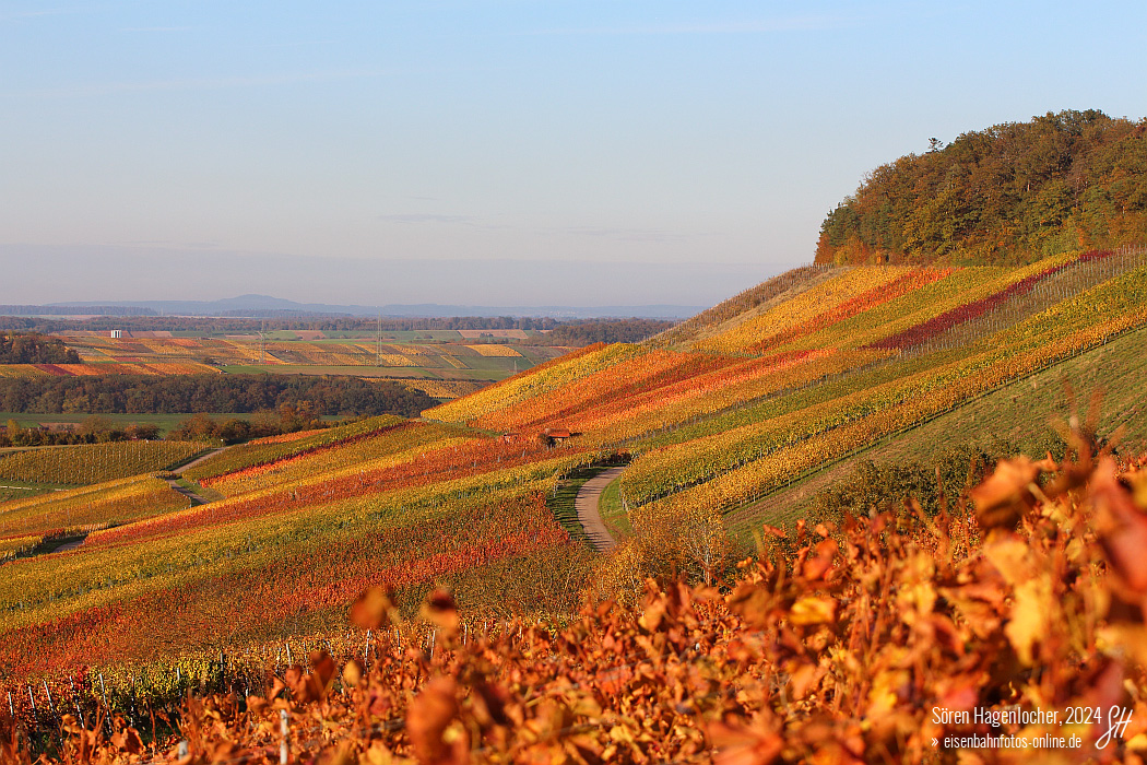 19Herbst in Kleingartach Bereits im Jahr 2021 konnte ich ein schönes Foto mit den Kleingartacher Weinbergen aufnehmen. Damals konnten Sonnenblumen im Vordergrund eine ohnehin schon gewaltige Gewitterstimmung bunt aufwerten. Im Herbst benötigen die Weinberge hingegen für gewöhnlich keine bunten Blüten, um farbenfroh zu wirken. Da sich der Weinbau in Deutschland verändert, sehe ich mittlerweile gelungene Fotos dieser Kulturlandschaft als dringend an. An jenem Abend Ende Oktober 2024 hatte man einen schönen Fernblick Richtung Stettener Weinberge.