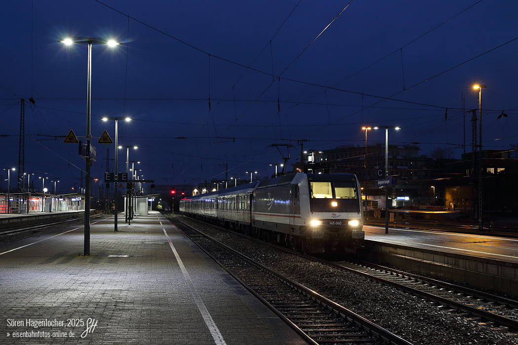 19 Einladung zur blauen Stunde Am letzten Novemberwochenende 2025 pendelte TRI mit dem RE 8 baustellenbedingt nur zwischen Bietigheim-Bissingen und der Landeshauptstadt. Diesen Umstand nutzte ich für ein Foto in der blauen Stunde, das sich – wohlbemerkt bei Gleislotterie – in Bietigheim-Bissingen anbot. Bei leichtem Regen stand 145 040 mit DPN 34069 Bietigheim-Bissingen – Stuttgart Hbf stimmungsvoll zum Fototermin bereit. Die Vielfalt der Farbgebungen der Baureihe 145 während der Jahre des Ersatzverkehrs ist bemerkenswert. Diese Lok hatte ich 2022 noch in Verkehrsrot vor einem Kohlezug in Lauffen am Neckar fotografiert. |
