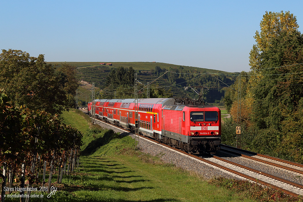 13Baureihe 114, die erste Derzeit gibt es zahlreiche Fotostellen, die mit den "neuen Baureihen" umzusetzen sind, daher wird es selbst als Hausstreckenfotograf aktuell nicht (gleich) langweilig. 114 024 und 114 002 bespannten am 16. Oktober 2016 in planmäßiger Sandwichbespannung die RB 19123 (Neckarsulm - Stuttgart) und wurden von zwei Fotografen am Lauffener km 44,4 abgelichtet. Der Countdown läuft: Maximal 3 Jahre und 2 Monate wird man insgesamt für solche Fotos Zeit haben - es sei denn, es ändert sich bereits vorher etwas.