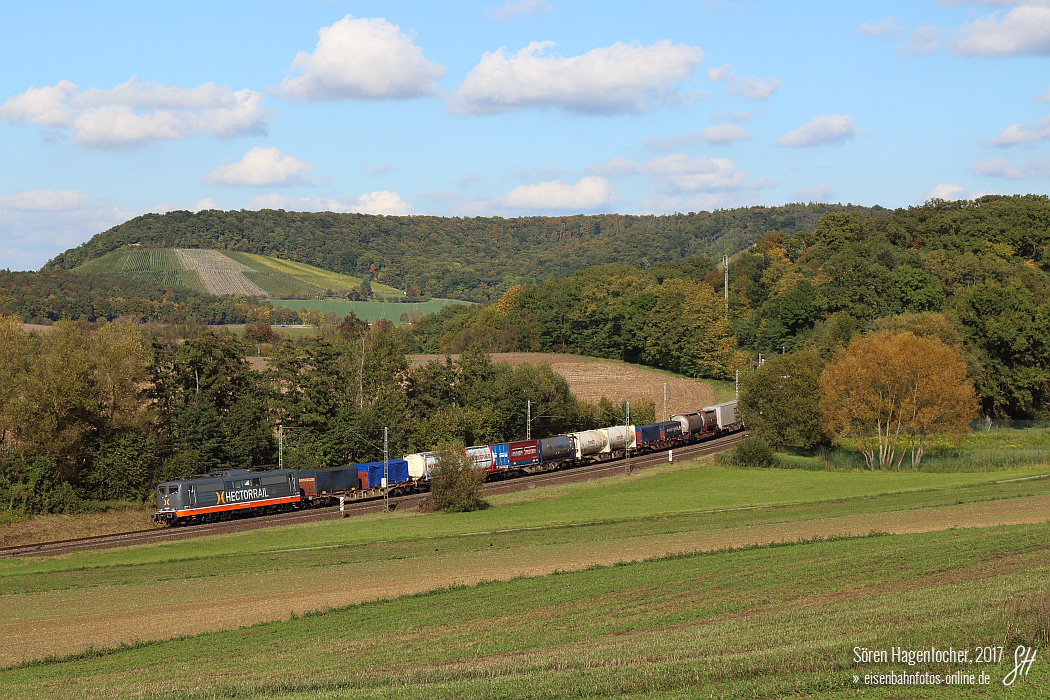 13Moderne Farben für die 151 Am letzten Tag der Rastatt-Umleiter, dem 1. Oktober 2017, konnte ich doch tatsächlich noch einen Güterzug von HECTORRAIL fotografieren - und das sogar bei fast vollständigem Sonnenlicht. 162.005 "Herzog" (man kennt sie auch als 151 133) rollte um 15:36 Uhr mit ihrem DGS 46118 auf dem Weg von Basel SBB RB nach Krefeld-Uerdingen durch Ölbronn, nachdem sie via DSO Live-Sichtungen bei Eutingen im Gäu etwa zwei Stunden vorher gemeldet wurde. Es warteten lediglich zwei Fotografen auf den frisch revisionierten Sechsachser. Schade, dass die Züge hier nicht weiterhin verkehren - das eine oder andere Motiv hätte man noch "abarbeiten" können.