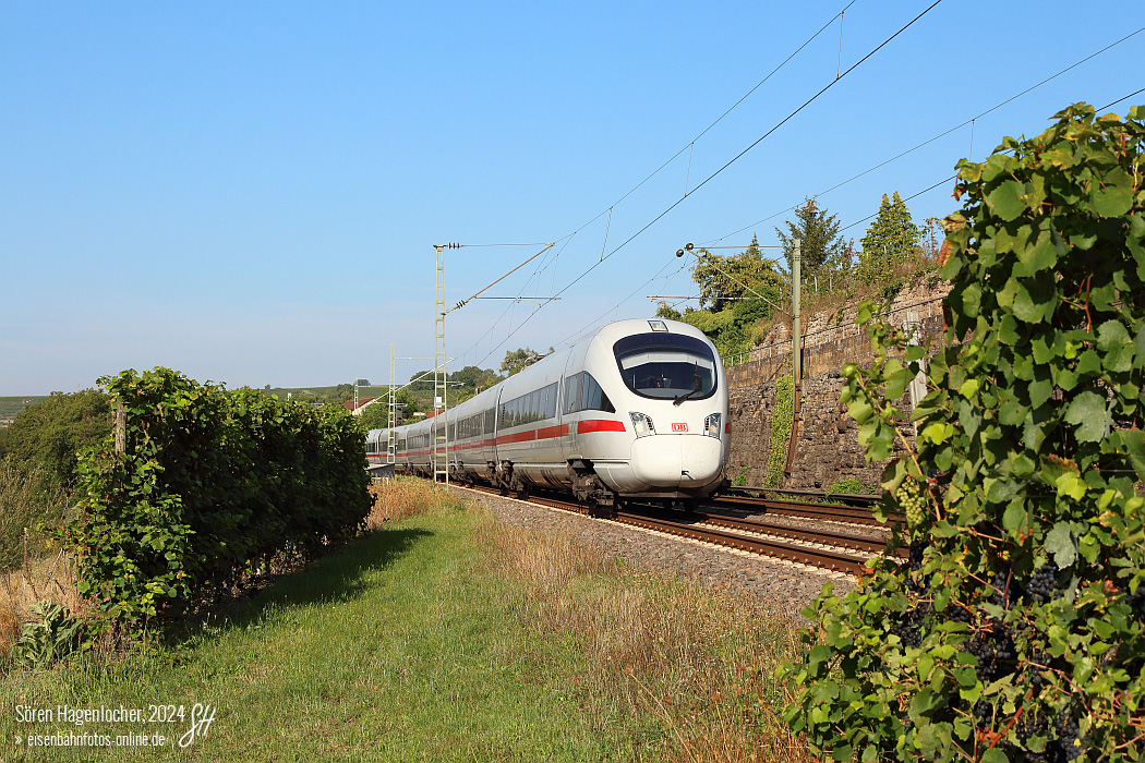 9Samstäglicher ICE-T im Spätsommer Die Sperrung der Riedbahn brachte nicht nur den ICE 4 planmäßig auf die Frankenbahn, sondern auch den ICE-T. Auf der südlichen Frankenbahn war jedoch ausschließlich eine Leistung mit der Baureihe 411 gut im Licht, die Fotostellen jedoch dennoch leider nicht reich gesät. Für meine erste Begegnung seit den letzten planmäßigen Verkehren im Jahr 2020 suchte ich mir die Stützmauer um km 41,6 aus. Die roten Trauben hatten bereits eine schöne Farbe und die Weinlese war am 7. September 2024 nicht mehr weit, als 411 029 "Kiel" als ICE 1176 Stuttgart Hbf - Hamburg-Altona diese Lauffener Reben passierte.
