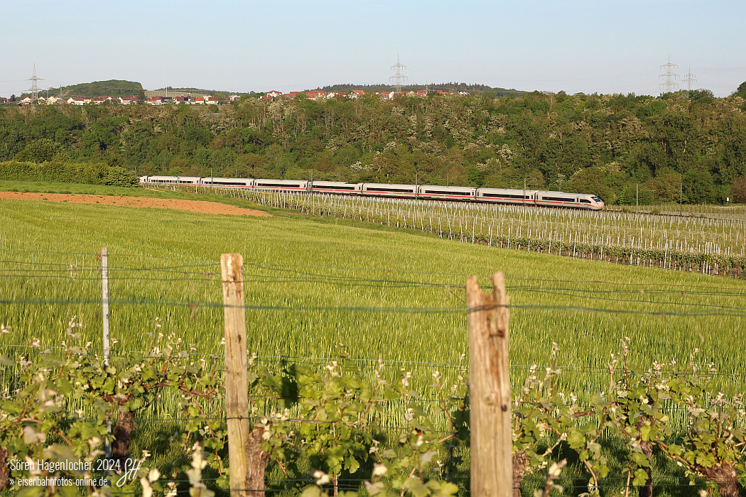 5Fernverkehr in den Weinbergen Am Abend des 10. Mai 2024 verkehrte wieder einmal ein ICE auf der Frankenbahn. Um diese Uhrzeit ist die Fotostellenauswahl jedoch stark begrenzt, gerade für einen 13-teiligen Triebzug. So positionierte ich mich in den Lauffener Weinbergen, die aus diesem Blickwinkel immer nur an den ersten langen Abenden aufgenommen werden können, da die Reben schnell hochwachsen und die Sicht verdecken. Obwohl ich vor dem Losfahren zunächst Bedenken hatte bezüglich vorhandener Schleierwolken, waren diese vor Ort glücklicherweise nicht vor der Sonne. 412 051 konnte als ICE 1079 Hamburg-Altona - Stuttgart Hbf daher gemütlich fotografiert werden.