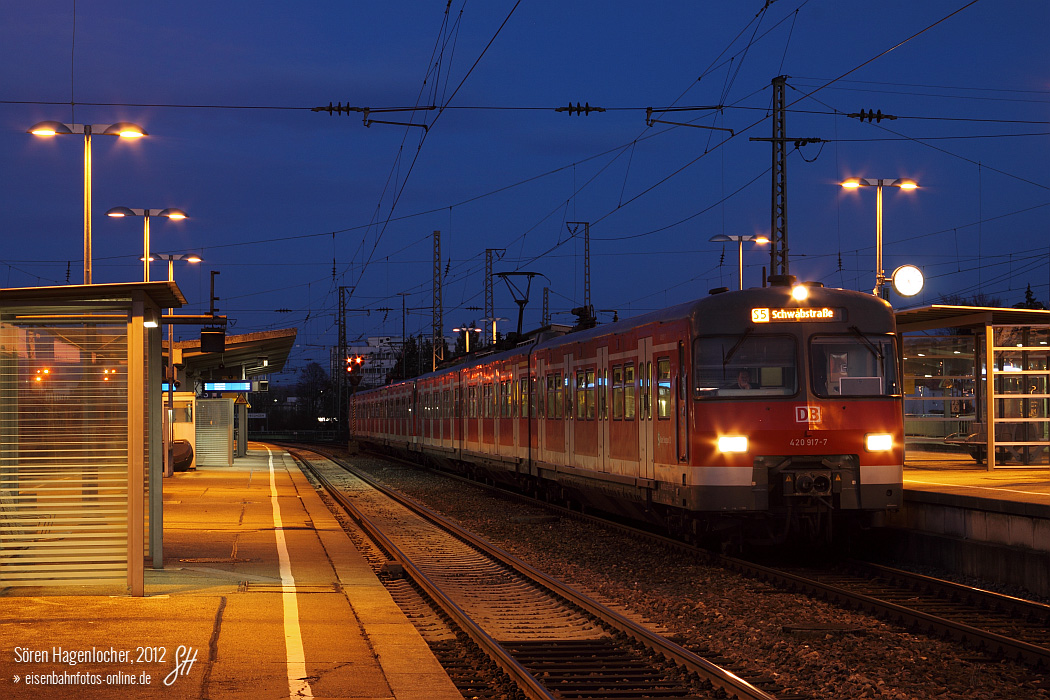 14Zum Abschied Im November 2016 endete die Beheimatung der Baureihe 420 bei der S-Bahn Stuttgart im Betriebshof Plochingen. Zu diesem Anlass habe ich ein Foto aus meinem Archiv aufbereitet, das auf der S5 entstanden ist. Vor einem ausgiebigen Raclette-Abend mit Wein und Bowle stand die S 7569 mit 420 417 und 420 434 in Bietigheim-Bissingen für mich auf dem Programm. Der Einsatz der Baureihe 420 endete auf der S5 bereits wenige Monate später - das Jahr 2012 unterdessen knappe sieben Stunden nach der gezeigten Langzeitbelichtung. Beide Triebwagen fanden 2014 bei der S-Bahn Rhein-Ruhr eine neue Heimat.