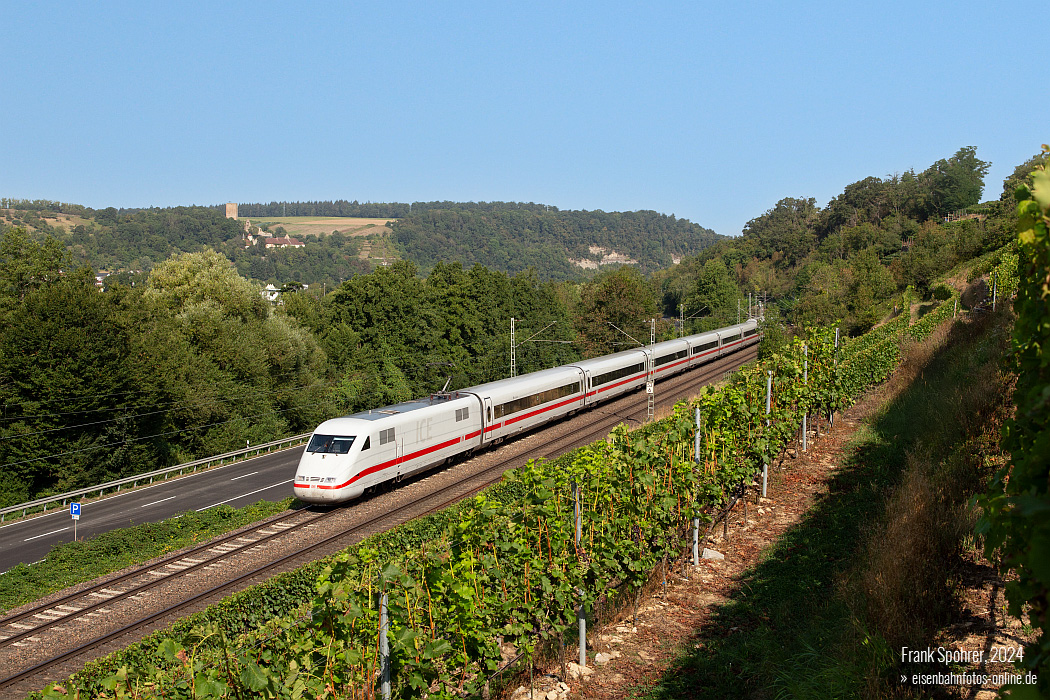 10 Samstäglicher ICE-T im Spätsommer Die Sperrung der Riedbahn brachte nicht nur den ICE 4 planmäßig auf die Frankenbahn, sondern auch den ICE-T. Auf der südlichen Frankenbahn war jedoch ausschließlich eine Leistung mit der Baureihe 411 gut im Licht, die Fotostellen jedoch dennoch leider nicht reich gesät. Für meine erste Begegnung seit den letzten planmäßigen Verkehren im Jahr 2020 suchte ich mir die Stützmauer um km 41,6 aus. Die roten Trauben hatten bereits eine schöne Farbe und die Weinlese war am 7. September 2024 nicht mehr weit, als 411 029 "Kiel" als ICE 1176 Stuttgart Hbf - Hamburg-Altona diese Lauffener Reben passierte. |