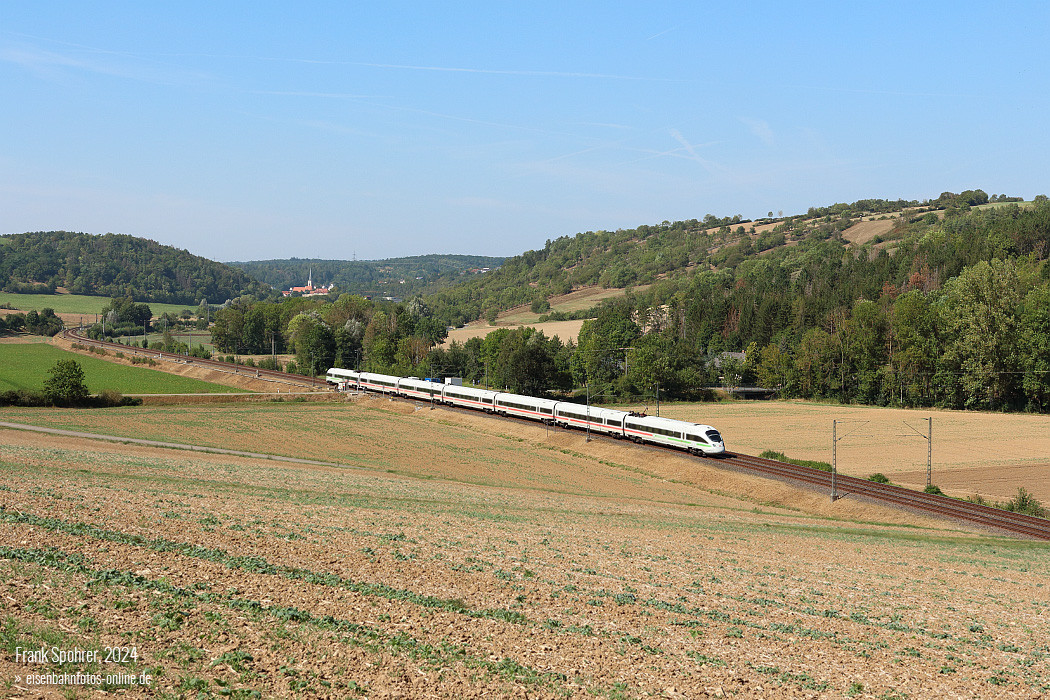 12 Zwischen Taubertal und Hauptstadt: ICE "Weimar" auf dem Weg nach Berlin 411 027 "Weimar" hat mit dem nur freitags und samstags verkehrenden ICE 1696 Stuttgart Hbf – Berlin Ostbahnhof am 7. September 2024 gerade Grünsfeld hinter sich gelassen. Die spätsommerliche Landschaft lag ruhig unter einem warmen Himmel, während der Zug mit seinem selten gewordenen Klimaschützer-Design durch die Hügel glitt. Ab Würzburg war es jedoch vorbei mit der Leichtigkeit: Eine "Reparatur an der Strecke" bremste den Lauf des ICE um fast zwei Stunden aus, die er bis Berlin auch nicht mehr einholen konnte. Frank Spohrer stellte diese Aufnahme freundlicherweise zur Verfügung. |