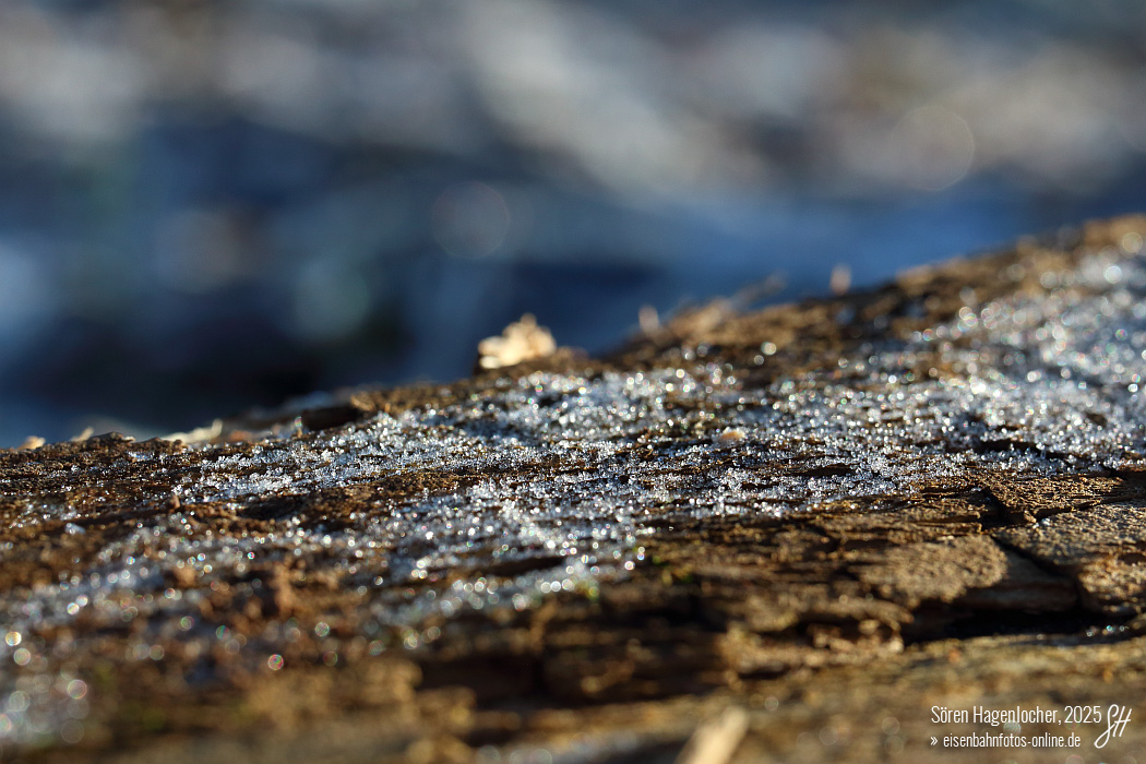 4 Winterhauch auf altem Holz Zu Weihnachten habe ich mir ein Makro‑Objektiv gegönnt, mit dem ich gezielt in eine Welt abtauchen kann, die man ohne ein solches Objektiv ganz anders wahrnimmt. Das Tolle daran ist, dass sich im Gegensatz zur Eisenbahnfotografie sogar Tage mit Schleierwolken hervorragend für die Makrofotografie eignen. Am 27. Dezember 2025 sind bei einem Spaziergang rund um mein heimisches Stetten am Heuchelberg einige Aufnahmen von Raureif entstanden. Eine davon möchte ich hier zeigen - es handelt sich um einen Ausschnitt eines kleinen Holzbretts, das auf einem Wiesenweg lag. |