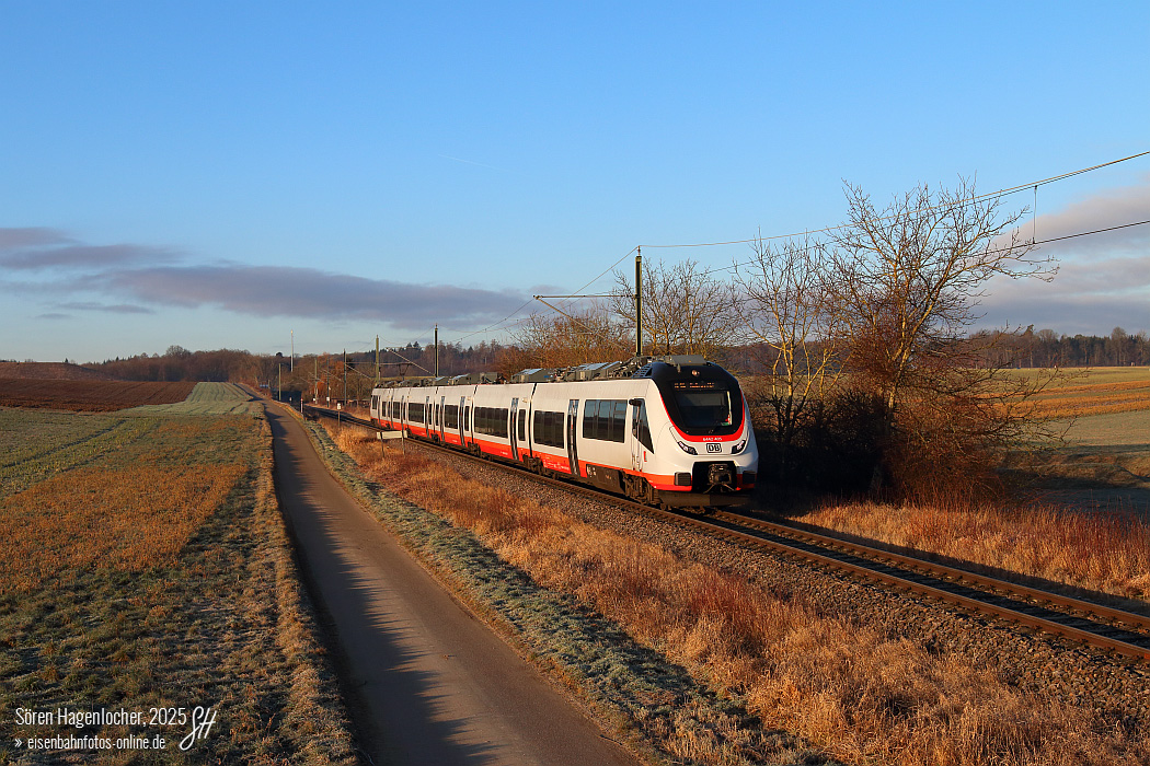 2Vorarlberger nun mit DB-Logos So etwas hatte ich zuvor noch nicht erlebt. Bei komplett wolkenlosem Himmel war ich an jenem 28. Dezember 2025 ins knapp 20 Minuten entfernte Babstadt aufgebrochen. Je näher ich der Fotostelle kam, desto mehr Wolken zogen jedoch auf. Als ich ankam, lag die Stelle bereits vollständig im Schatten. Und genauso schnell, wie sich der Himmel zuvor gefüllt hatte, war er plötzlich wieder wolkenfrei: Pünktlich zur Durchfahrt von 6442 405, der als DRB 19265 Mannheim Hbf – Heilbronn Hbf unterwegs war, strahlte die Wintersonne bei rund 7 Grad Sonnenstandshöhe. Aufnahme vom Hochstativ.